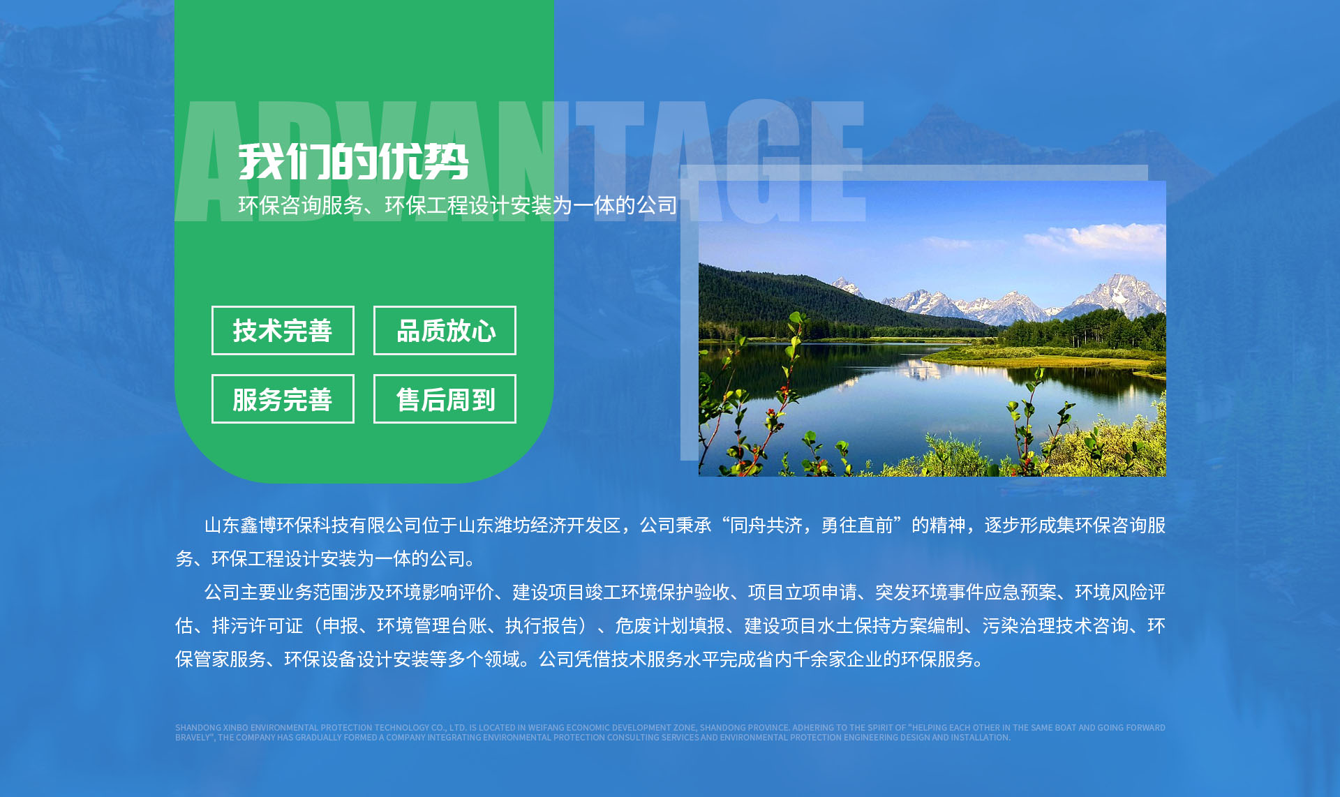 公司主要業務范圍涉及環境影響評價、建設項目竣工環境保護驗收、項目立項申請、突發環境事件應急預案、環境風險評估、排污許可證(申報、環境管理臺賬、執行報告)、危廢計劃填報、建設項目水土保持方案編制、污染治理技術咨詢、環保管家服務、環保設備設計安裝等多個領域。公司憑借技術服務水平完成省內千余家企業的環保服務。